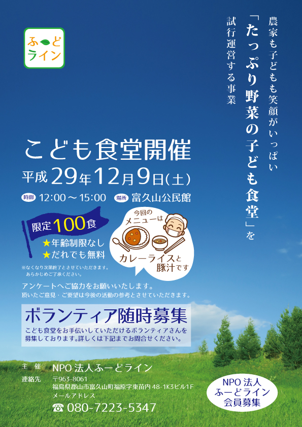 2024年10月21日(月) 2024年11月18日(月) 2024年12月16日(月) 第24回・25回・26回子ども食堂開催いたします。 会場/芳賀地域公民館 時間/16:00~18:00 子ども100円/大人300円です。 先着60食になりますので是非お越しください。