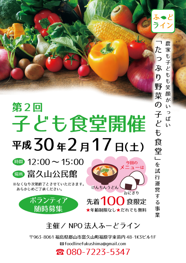 2026年01月19日(月) 2026年028月16日(月) 2026年03月16日(月) 子ども食堂開催いたします。 会場/芳賀地域公民館 時間/16:00~18:00 子ども100円/大人300円です。 先着60食になりますので是非お越しください。
